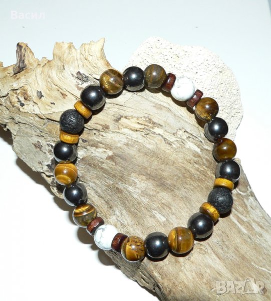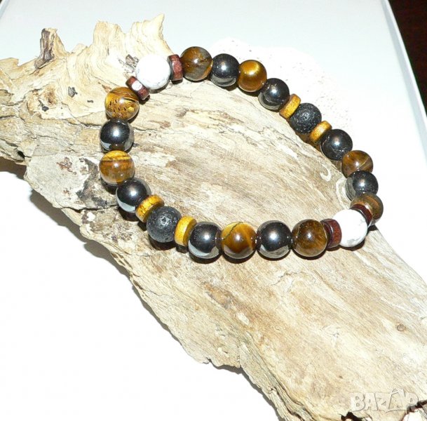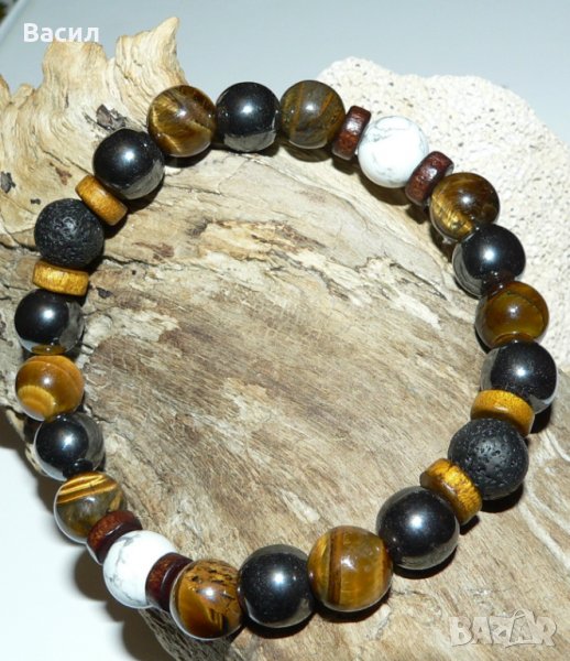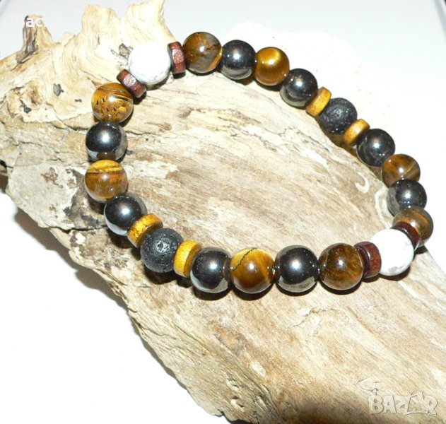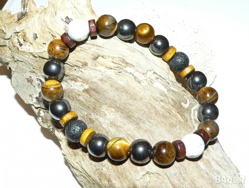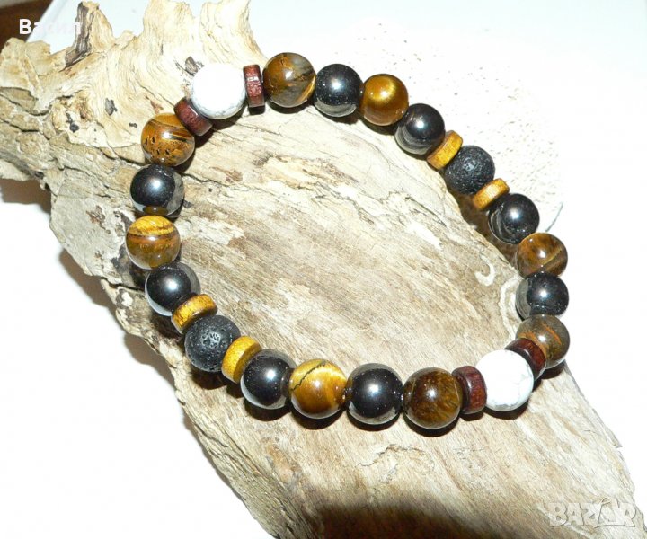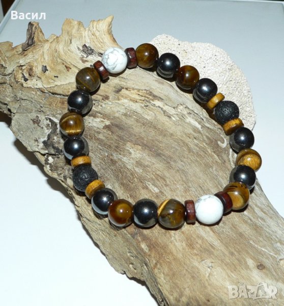 Предлагаме на вашето внимание ръчно изработена стилна мъжка гривна. Освен страхотен аксесоар и допълнение към вашия имидж, тази гривна ви носи и енергията с която са заредени естествениете полускъпоценните камъни създавани с векове от природата. Обработени във форма на 10 милиметрови сфери и подредени в един класически аксесоар, с който всеки мъж би желал да подчертае стилът си. Гривната е изработена от следните полускъпоценни камъни с техните характеристики и приложения: Хематит - спомага за развитие на логическото мислене, и откриване на пълния умствен потенциал. Повишава самочувствието и себеуважението. Смята се, че тези камъни притежават Ин и Ян енергия, което е необходимо за добро здраве.Ще ви помогне да се избавите от негативността и да постигнете душевен мир. Изключително полезен при проблеми с кръвното.