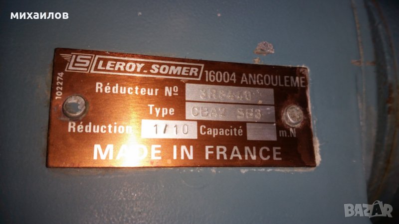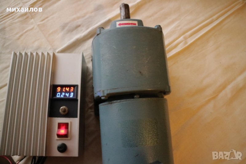 LEROY-SOMER 0.37KW,180V DC /3000об/мин,двигател- 400mm X 150mm. Редуктор 1/10 и управление Leroy-somer. Диаметър на оста 20 mm. Настройка на обороти от 0 до 250 об/мин. Захранване- 220V , 50Hz . Върти и в двете посоки. Приблизително около 70 нютона на ф20mm на оста. Френско производство.