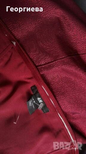 Роклята е идеална за повод!Нова, без хартиен етикет и цената е съобразена с това.Закопчава се с дълбок и удобен цип, от лявата страна.Цветът е бордо и е доста капризен за снимане, защото има лъскавина и блясък.Най-добре се вижда (цвета) на снимката с етикета.Полата е с втъкани червени метални нишки.Бюстието е със силиконова лента, като има и подплата, а полата е без подплата и без еластичност, формата ѝ е леко скосена в долната част.От подплата няма нужда, защото платът е такъв, че не полепва.