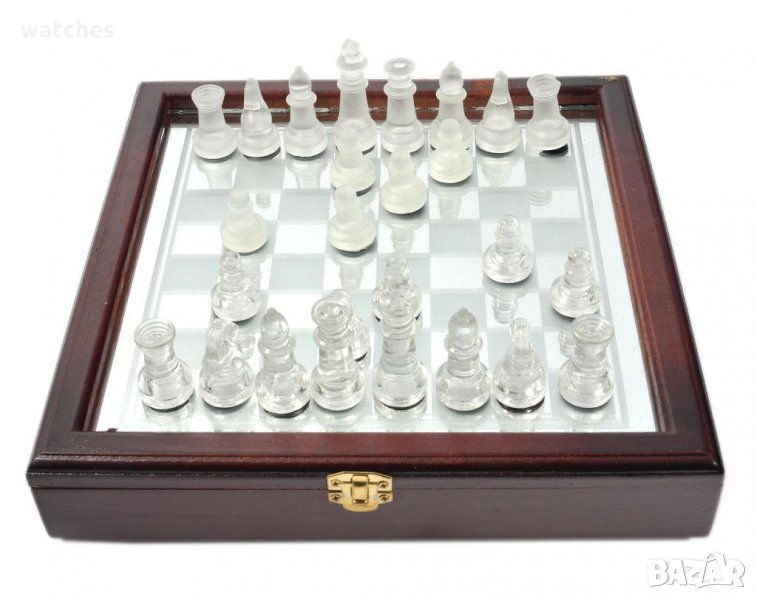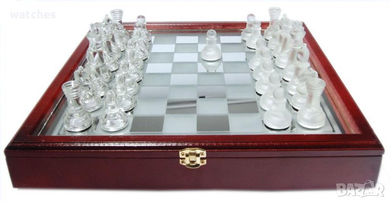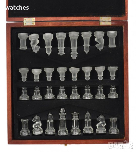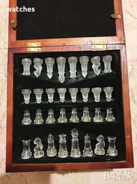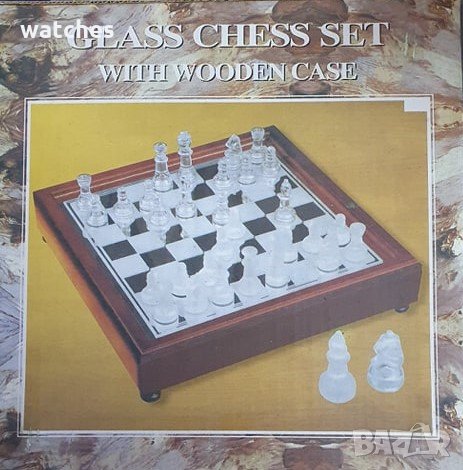 Стъклен шах в дървена кутия.