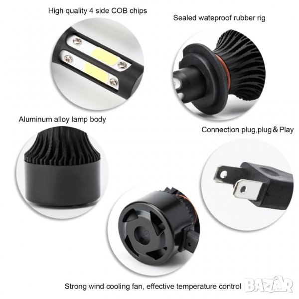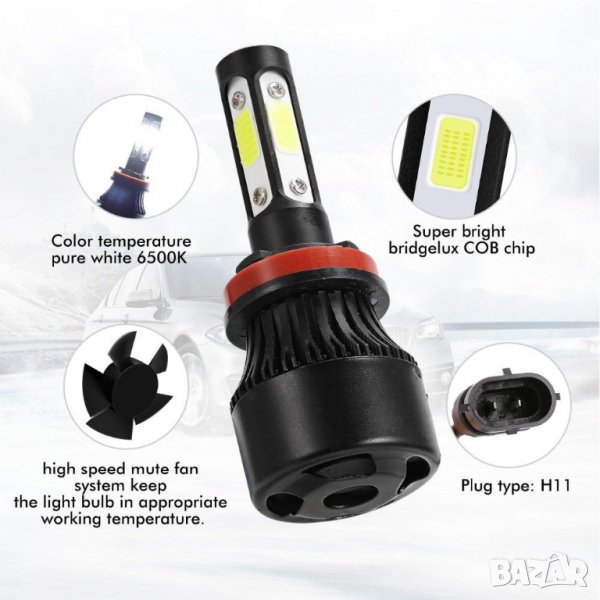 LED крушките са с ( BRIDGELUX) COB 2ра генерация диод от ново поколение, монтиран върху МЕДЕН радиатор с по-добро охлаждане имат и вентилатор с 17000 оборота в минута . Създават светлинен поток с над 300 % по-ярка светлина, спрямо стандартните халогенни крушки и са подходящи за всички фарове с рефлектори.