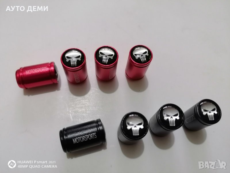 Цена за 1 комплект от 4 броя капачки череп с надпис , бял череп или червен череп - 5.60 лв.