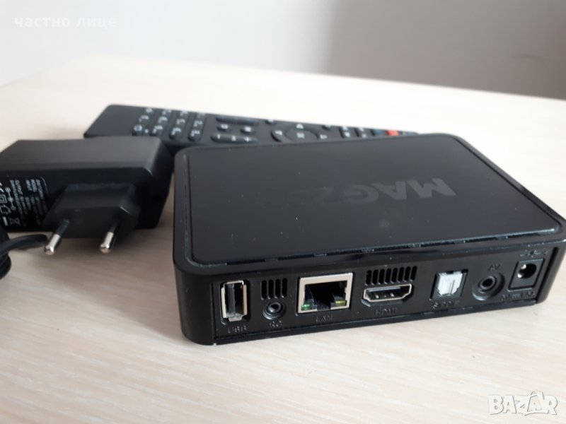 MAG250 - приемник за IPTV, телевизия през Интернет в комплект със захранване за него и дистанционно.
