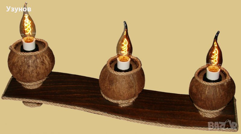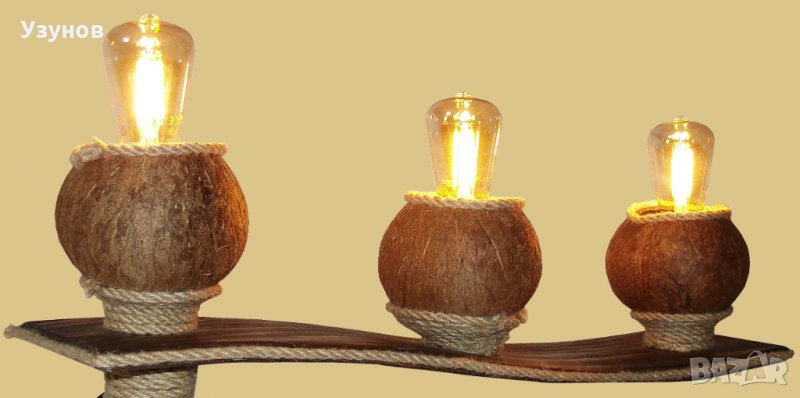 Уникална лампа от дърво и кокосови орехи в битов/винтидж стил → Обява 28047433