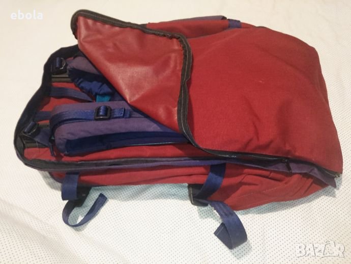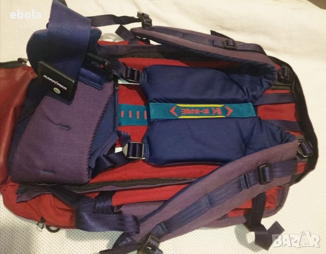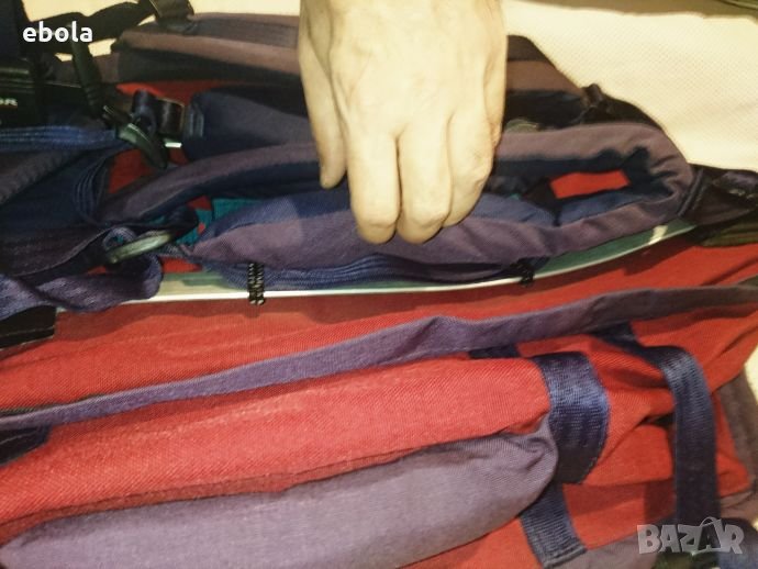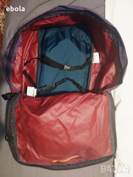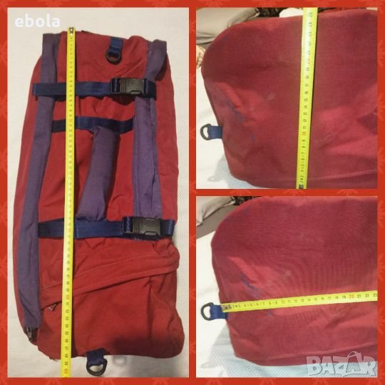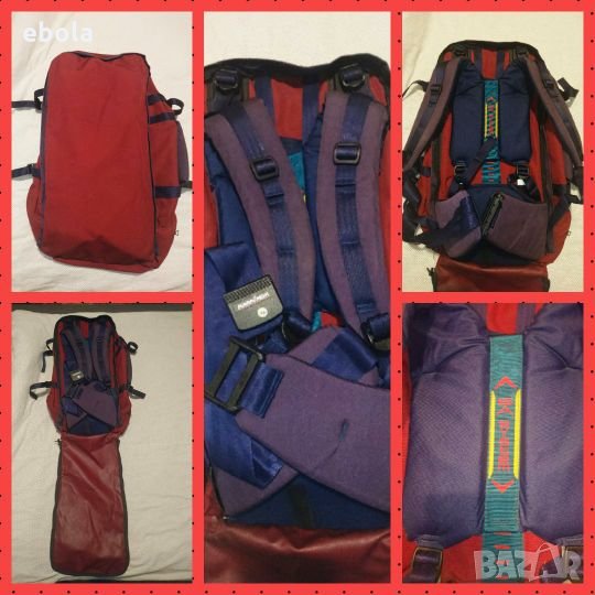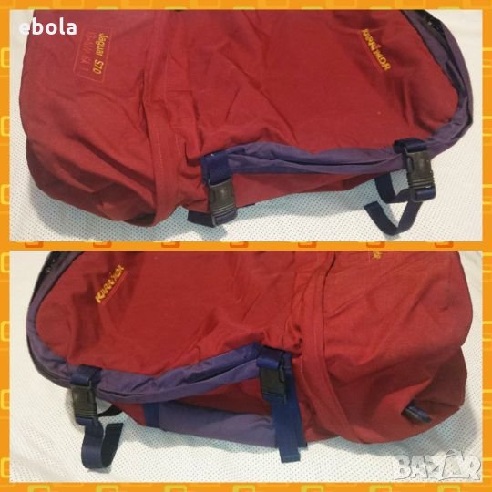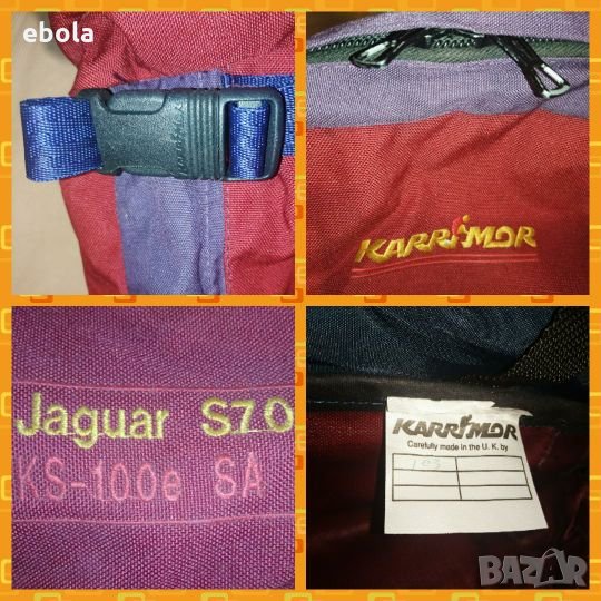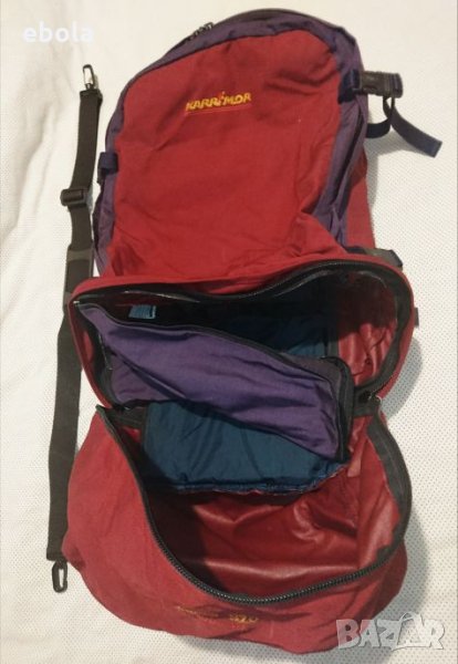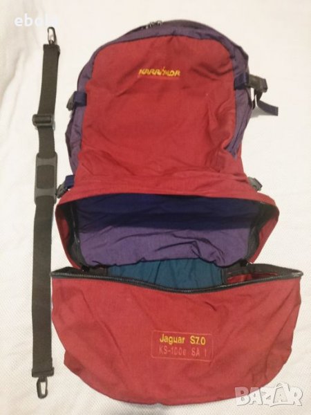 Karrimor Jaguar 70 ks100e SA Раницата е без забележки с изключение на петно на дъното,което не съм опитвал да чистя. С допълнително отделение,което може да се съединява с основното. Гумирана отвътре и с много здрави ципове. Много практична - презрамките се скриват в дъното и става на сак с дръжка и презрамка. На гърба (дъното на сака) е с алуминиева конструкция, която е изключително лека,но практична. Раницата е с регулируем гръб според височината на ползващият.