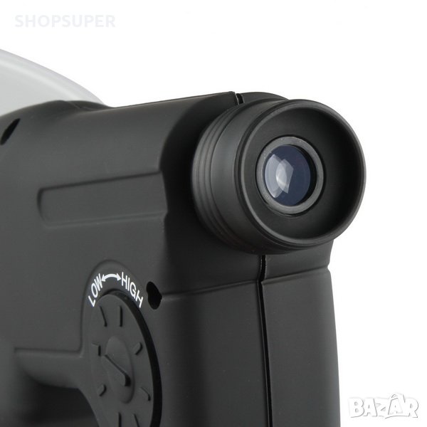 открито.Варианти за използване : за подслушване,наблюдение,лов и др.Параболичната чиния приема и страничен звук, дори да не е насочена пряко.3 в 1 : слушане, гледане,запис. Прибавена е система за записване на звука до 12 секунди нацифров чип. Звука може да се записва директно на друго устройство неограничено време дотогава,докато задържате бутона за слушане.За целта ще ви е необходим допълнителен кабел с жак.В комплект с кожени слушалки.Работи с 9V батерия,която се поставя в дръжката.Монокъла е с 8 x увеличение и призмена оптична система.Продукта е изработен е от пластмаса,тегло 700 грама.