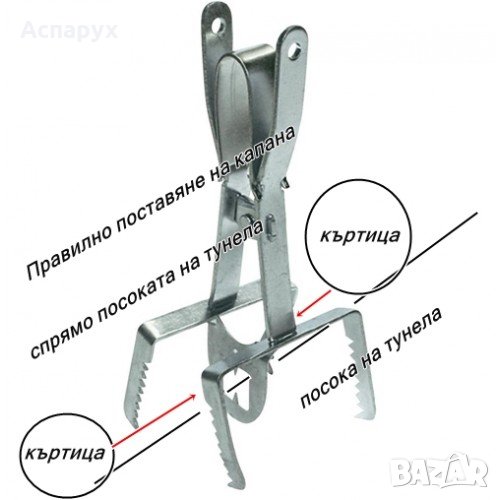 След като откриете тунела на подземен гризач, направете дупка с размер 10х10см./колкото капанът да влезе в нея/. Поставете в отвора на подвижната пластина някаква примамка - зеле, морков, картоф /за сляпо куче/. Заредете внимателно капана както е показано на снимките, след което го поставете в подготвения отвор в земята, като го ориентирате както е показано на третата снимка. Поставянето на примамка не е задължително. Къртицата или сляпото куче така или иначе ще дойдат по някое време да видяк какво става и да поправят тунела. Внимателно покрийте капана с пръст или го похлупете плътно с нещо. При правилно поставен капан, независимо от коя страна на тунела идва подземния вредител, той при всички положения ще бутне пластината и ще го задейства. Когато установите, че дръжките са раздаличени, проверете капана за хванал се натрапник.