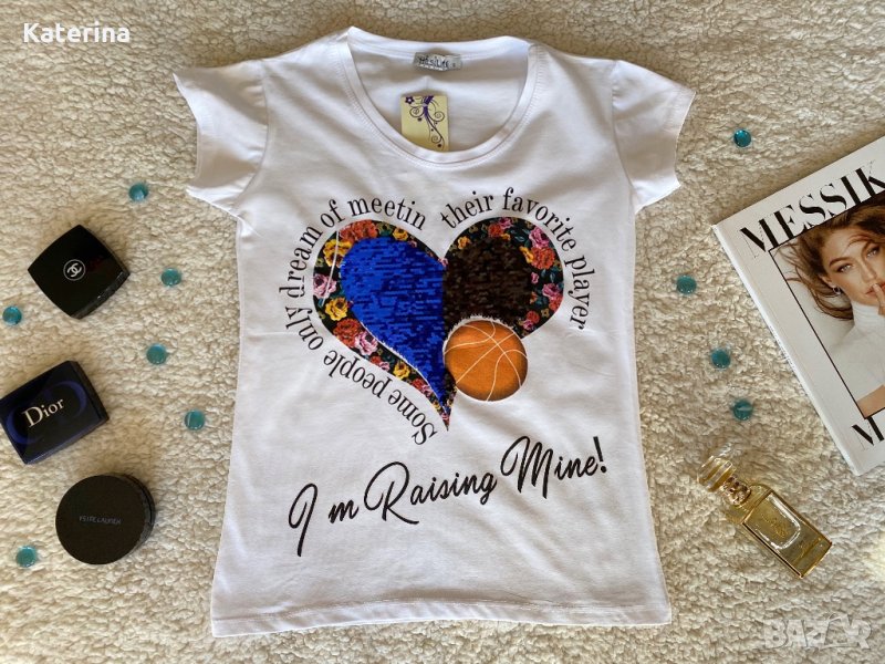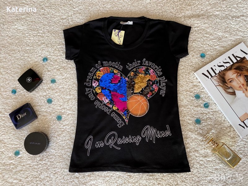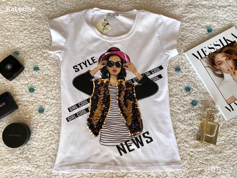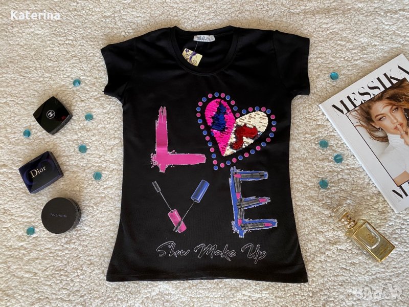 Блузки с обръщащи се двуцветни пайети и блузки с релефен надпис. Размери - S, M, L и XL.