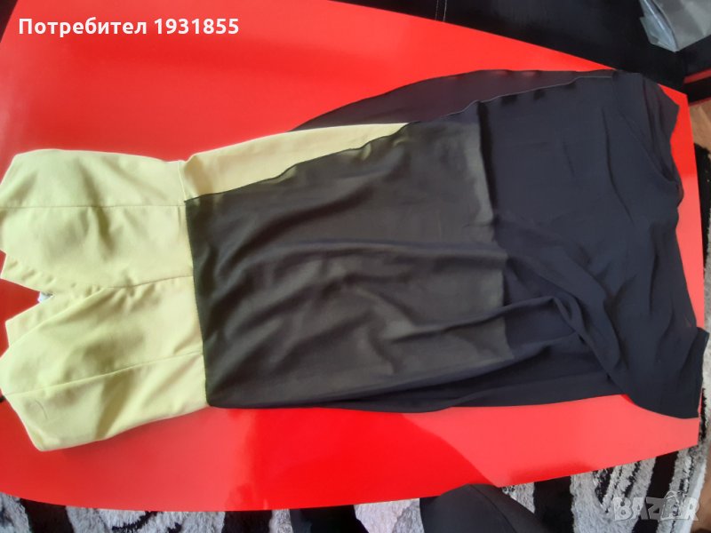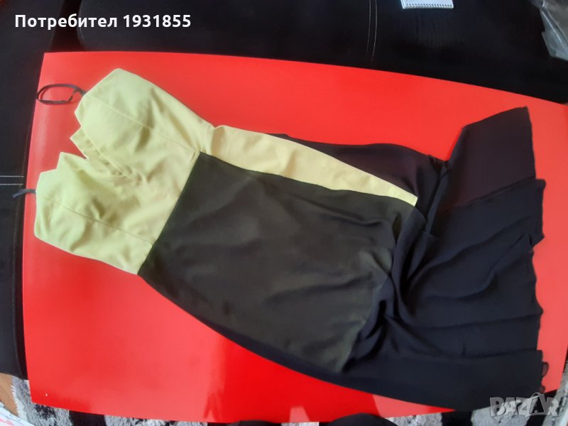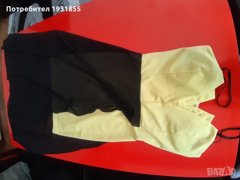Жълта къса рокля от талията се спуска черно воал който се разтваря покрай едното бедро секси деколте с подплънки рамките се регулиращи на гърба има 30 см цип състав 95% полиестер 5% еластандълж от под мишница 115см