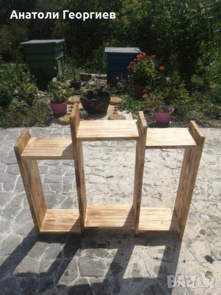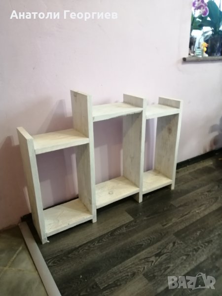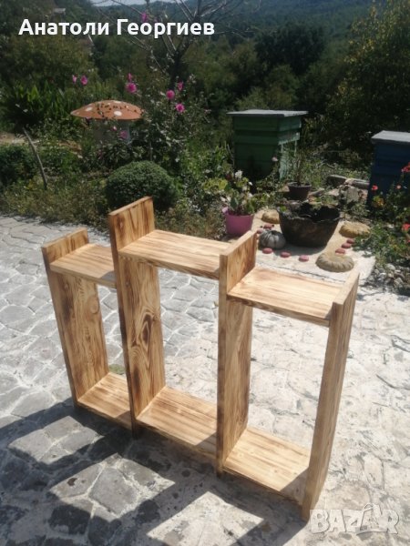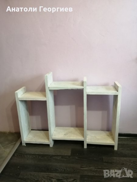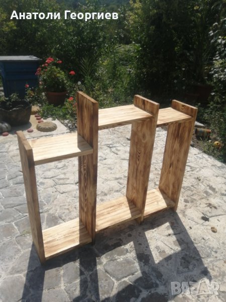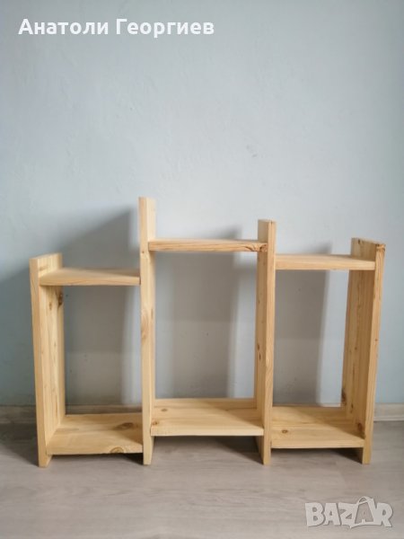 Етажерка, ръчна изработка от чамов материал с размери височина 70 см. ширина 90 см. дълбочина 18 см. може да се направи по различни размери.
