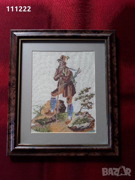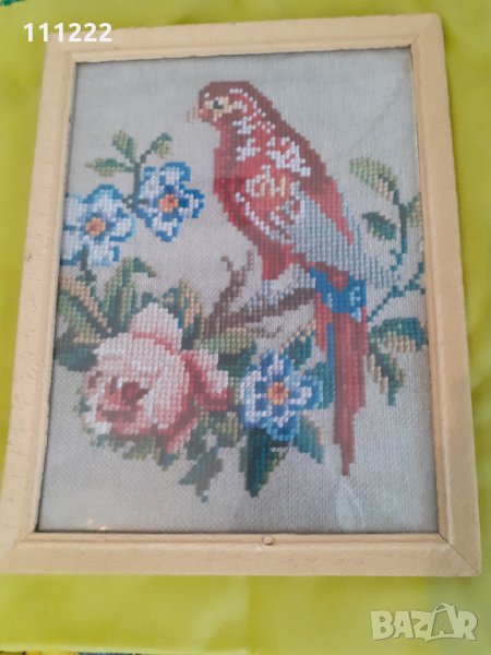 4. Продавам също така и картина-репродукция на същия този гоблен "Папагал върху венец с роза", която на просто око е почти неразличима от истински гоблен. Картината е в красива дървена ретро рамка от времето на соца. Размерите са: