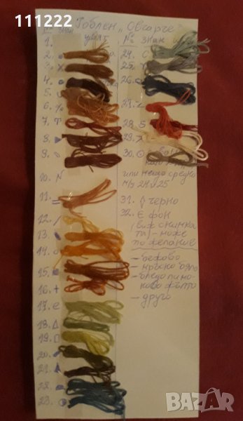 3. за гоблен "Овчарче" бод 1:1, 32 цвята: черно-бяла схема със символи заедно с легенда за необходимите конци и цветна снимка на ушит гоблен. Прилагам и мостра на необходимите конци /в моя вариант - този който аз съм ушила и комплектовала и на който е приложената снимка/. Размери на гоблена след ушиването приблизително 14 см/18 см при бод 1:1 - снимка 3 и 4