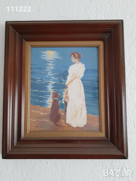 5. схема за гоблен "На морския бряг" - 18 цвята, бод 1:1. Другите наименования на гоблена са: "В очакване" или "Дамата на плажа с кученцето" - сн. 7. Схемата е черно-бяла върху 4 листа формат А-4. Прилагам легенда за необходимите конци - със съответните знаци и мостри от конците - за всеки цвят (т.е. знака и срещу него - съответния цвят конец). Също така прилагам списък с разходните норми за всеки цвят от конците - такава каквато е била при мен когато съм го шила.