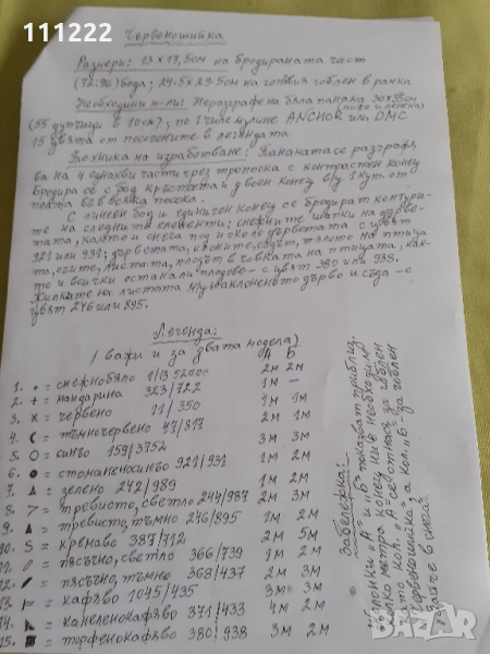 б) гоблен "Червеношийка" и гоблен "Зайче в снега", които в повечето случаи вървят като комплект - те са от по 2 стр. като на 2-та страница е дадена легендата за необходимите конци с разходната норма за всеки цвят и подробно описание за техниката на изпълнение - сн. № № 10 и 11 и сн. №№ 12 и 13