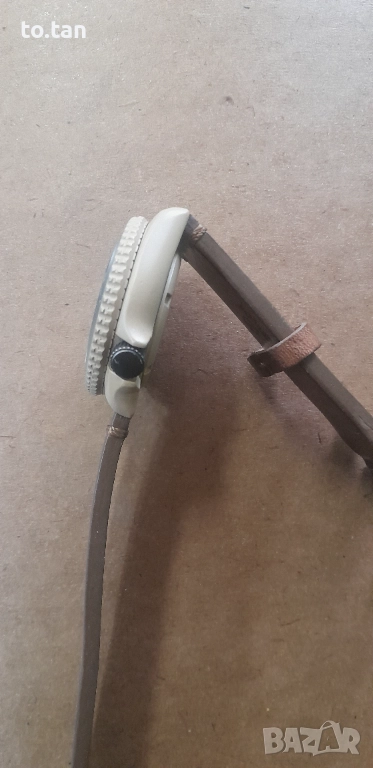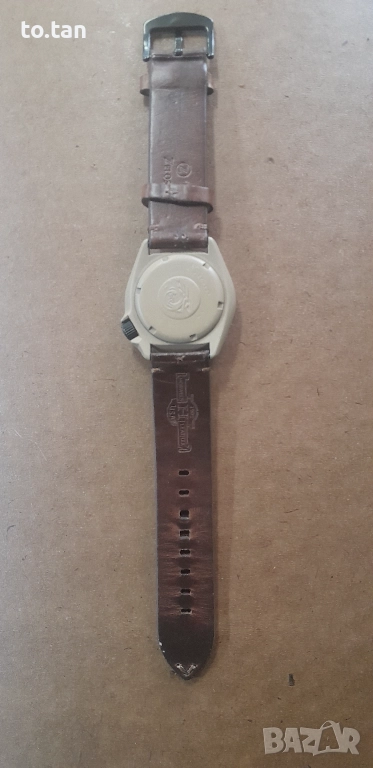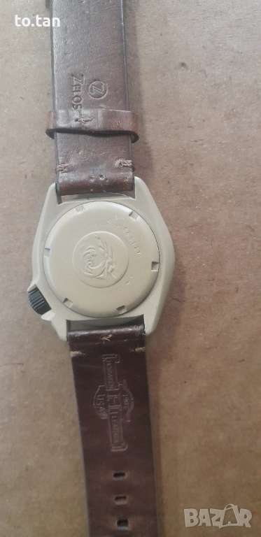 Цвят на покритието - каки. Часовникът е минал профилактика, сложено му е поръчково стъкло с дебелина 4,5мм. Сменен циферблат.