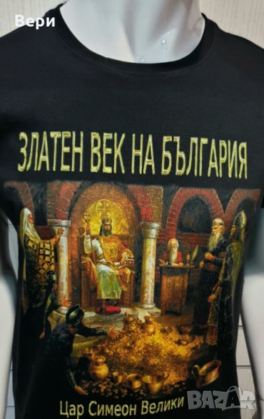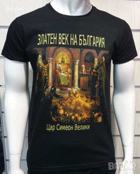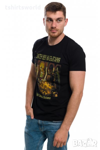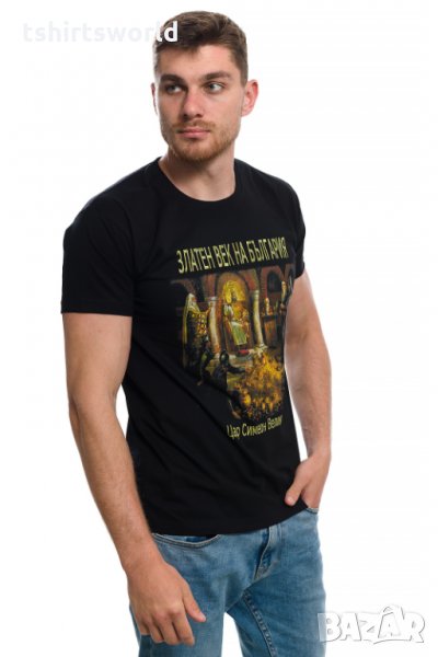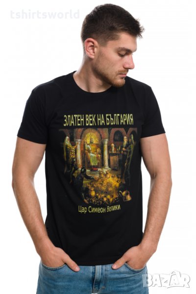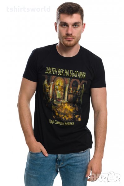 За ценителите на всичко българско и качествено представяме нашата страхотна мъжка тениска в черен цвят с дигитален печат Златен век на България - Цар Симеон Велики. Тениската е изработена в България под марката PRINTEX от висококачествен 100% пениран памук на 170 гр./м², който запазва цялостта на материята и наситеността на цветовете. С удобна кройка, тениската е свободна и позволява максимален комфорт при носене. Професионално изработен висококачествен дигитален печат, устойчив на пране с години. Тениската може да се пере при температура до 40 градуса. Спокойно можем да гарантираме за качеството на изработката и ярките цветове на дизайна.