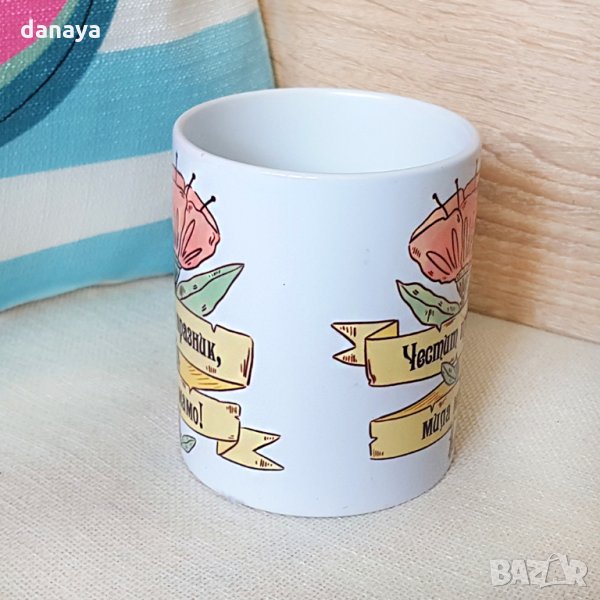 Бяла керамична чаша с нежен принт на цвете и надпис "Честит празник, мила мамо!" Тематичен дизайн, специално създаден за празника на жената. Чудесна идея за подарък за Осми Март.