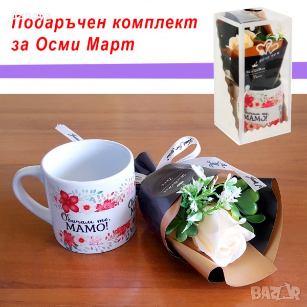 Подарък за мама по случай празника Осми Март, денят на жената. Зарадвай най-добрата майка с този красив и нежен подаръчен комплект. Състои се от чаша за кафе с принт на цветя и надпис "Обичам те, мамо!" и малък букет, поместени в подаръчна кутия.