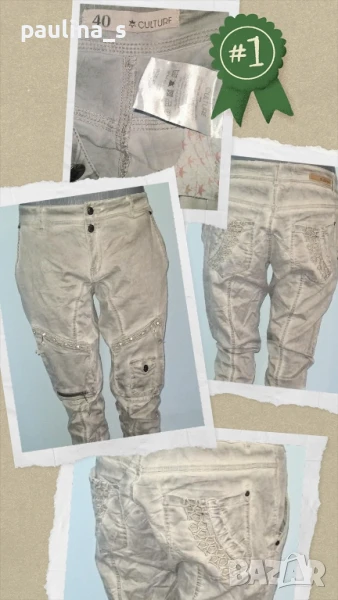 1️⃣. Колаж / M / XL - "Culture". Една бройка / аутлет. Цената е крайна 44,99лв / 22,5 евро. Изумително атрактивни дизайнерски дънки. Моделът е 5 pocket Denim с коси джобове и брич крачоли, ниска талия. Платът е мек и еластичен, покрива няколко размера. Декорациите са с външни обемни джобове, камъни и ципове.