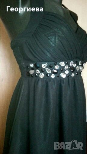 Роклята е чисто нова, видно и от снимките.Има красив декоративен колан от камъни.Горният плат е с призрачност, а подплатата има лъскавина, която се вижда и прави роклята приятно блестяща.Има вградени подплънки и на практика може да се носи и без сутиен, което я прави много удобна!По етикет е XS, но със сигурност е подходяща и за дама носеща S р-р.Това е така, защото ластиците на гърба са много разтегливи, а и талията е свободна.