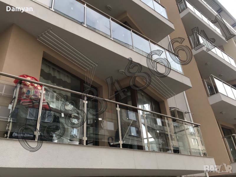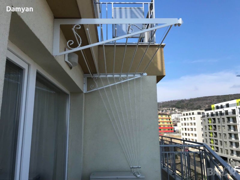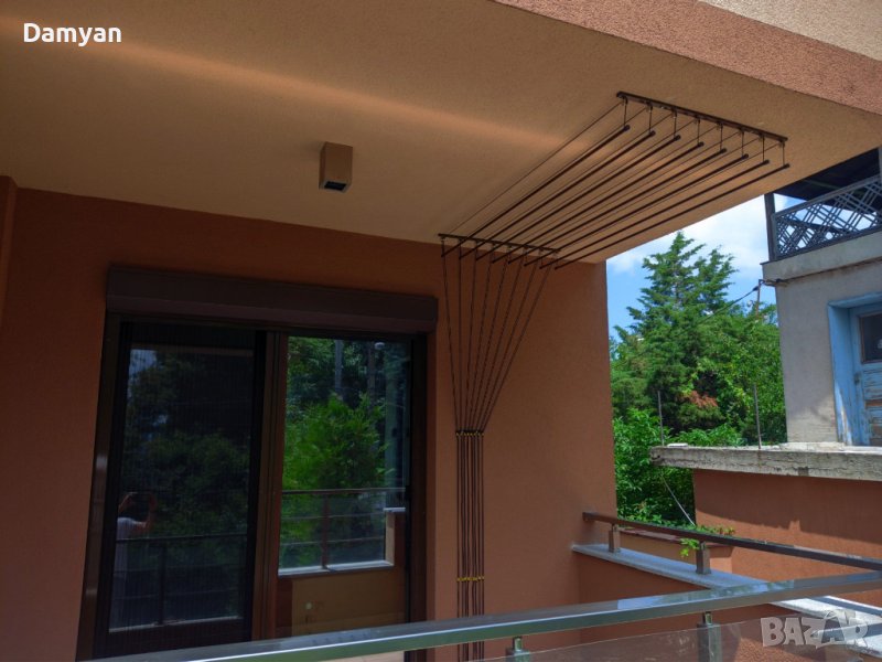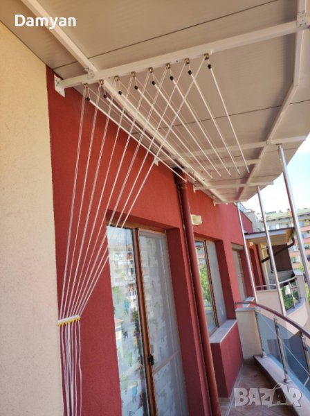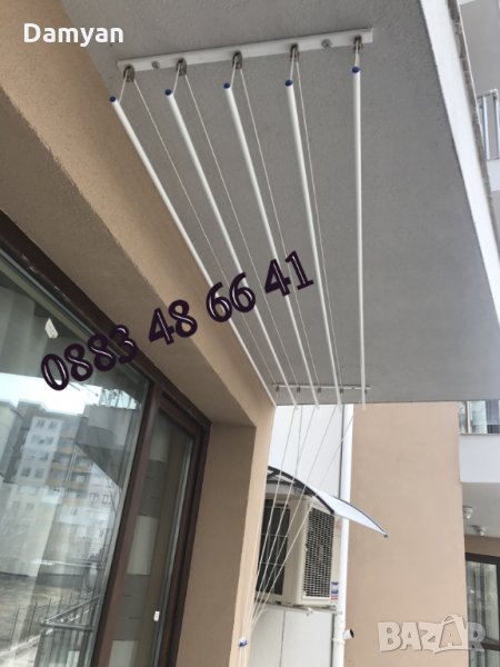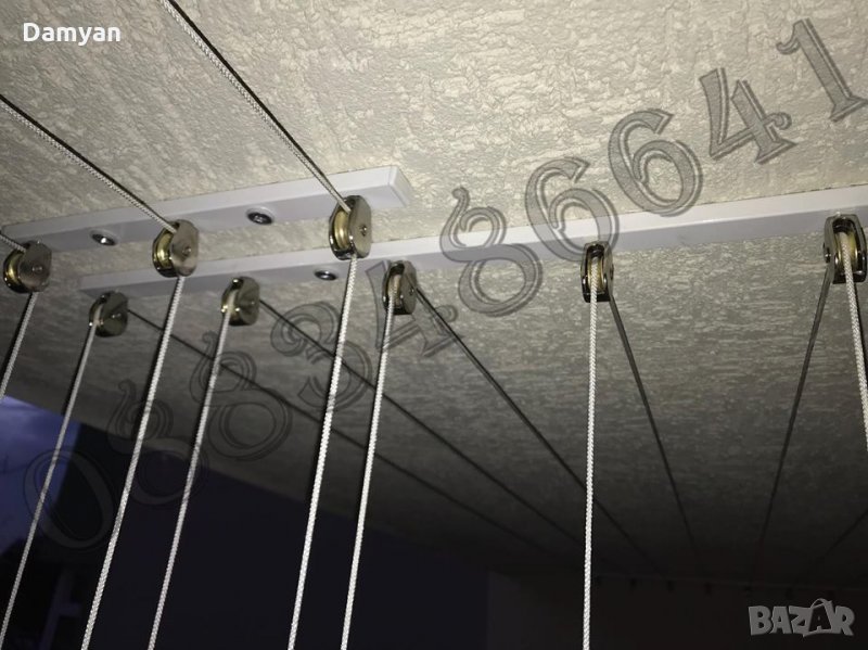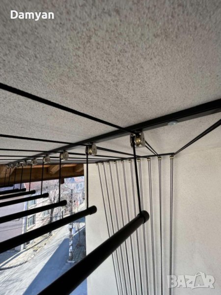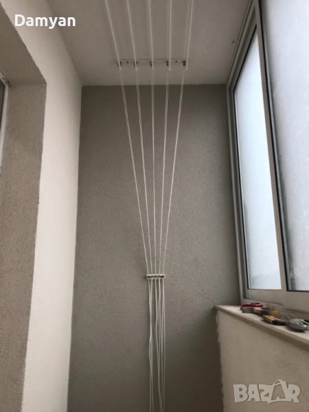 (Двойната ролка предотвратява оплитането на двете въжета и безпроблемна работа на простора при монтиране на закачалката към парапета или стената на помещението)