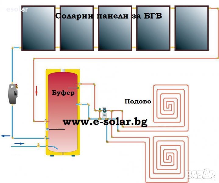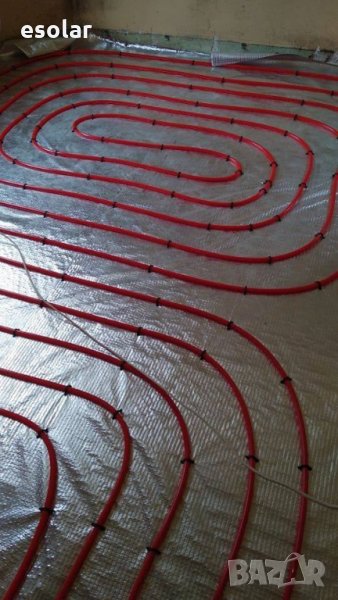 от, гранитогрес, ламиниран паркет, гранит или др. Топлата вода може да се черпи директно от термопомпа, пелетна камина/котел, газов котел, котел на ток, слънчеви панели и циркулира по тръбите с температура около 30-35ºC като успява да затопли пода обикновено до около 30 до 40 градуса и издигайки се нагоре към тавана създва равен температурен баланс в цялото помещение и температурата на въздуха в стаята може да достигне приятните и за най-студените зимни дни 24 - 26 градуса. Ние препоръчваме да се използва и буфер към системата, а с помощта на стайни термостати може да поддържате или сменяте желаната от Вас температура навсякъде и по всяко време на денонощието. Удобството и комфортът от меката топлина на плочките и килима са несравними.