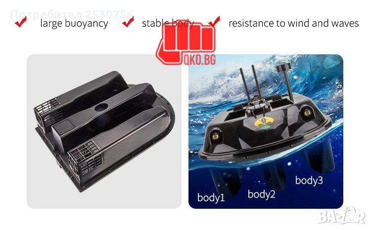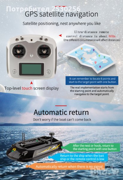 Лодка за захранка с товароносимост до 10кг с вграден Автопилот и GPS. Радио управляема лодка за нанасяне с реален обхват до 650 метра.