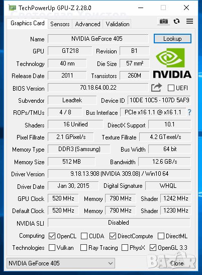 Продавам видео карта: Leadtek GF 405 512MB DDR3 64bit DVI DP LP PCI-E