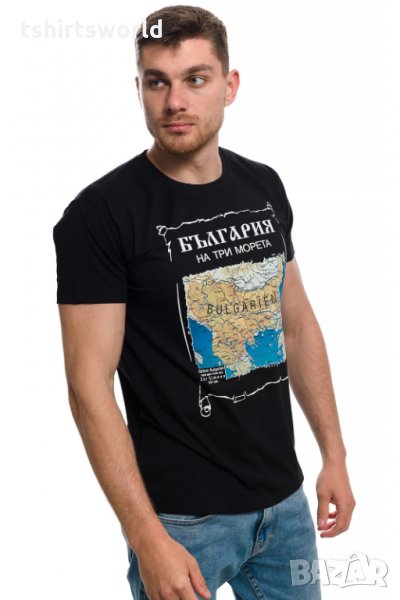 мъжка тениска в черен цвят с трансферен печат България на три морета, карта. Тениската е изработена в България под марката PRINTEX от висококачествен 100% пениран памук на 170 гр./м², който запазва цялостта на материята и наситеността на цветовете. С удобна кройка, тениската е свободна и позволява максимален комфорт при носене. Професионално изработен висококачествен трансферен печат, устойчив на пране с години. Тениската може да се пере при температура до 40 градуса. Спокойно можем да гарантираме за качеството на изработката и ярките цветове на дизайна.