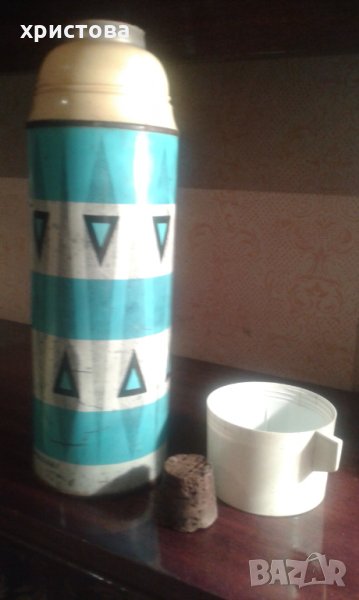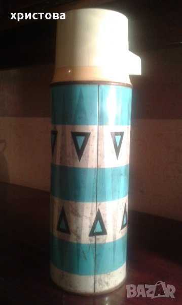 Стар термос,,Полвак,, от соца,с видими външни следи, но изцяло здрав.Вътрешната му бутилка е стъклена-за топли и студени напитки,здрава -1л.