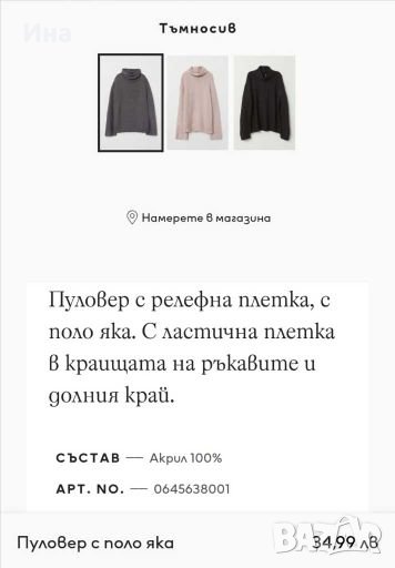 Пуловерът е обличан еброени пъти. Свободен, широк модел. По-скоро отговаря на р-р L.