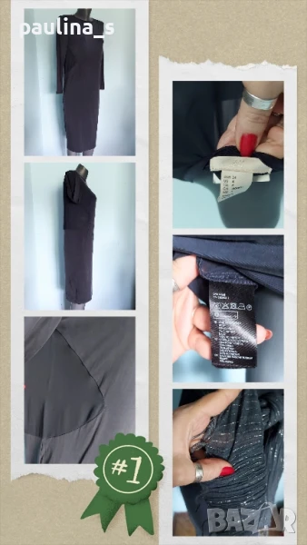 1️⃣. Колаж / L / 2XL - "H&M". Цената е крайна 39,99лв / 20 евро. Уникална рокля за повод. Моделът е с вклинени декорации от органза, обърнат трапец, долу е леко стеснена и талията не е подчертана. Материята е еластична коприна - suede, коприна и ликра с транслуцентен ефект, мени си нюансите на светлината. Има загадъчен силует и ефект, покрива няколко размера. Роклята е нова, една бройка, без дефекти. Шалът е купен за роклята от 100% памук и ламе - цена 9,99лв / 5 евро. Предпочитам да не се делят.