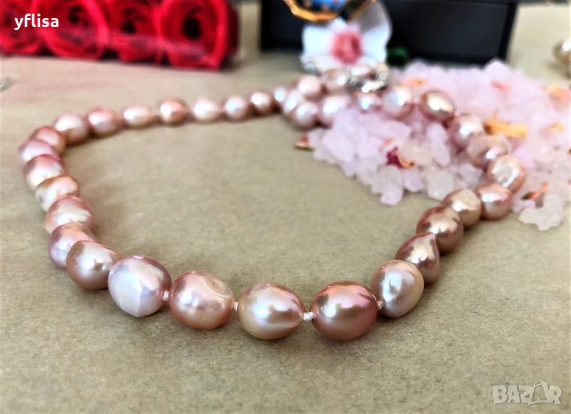 Зашематяващо колие с барокови перли прасковен цвят и интересна закопчалка с камъни, която може да бъде великолепен акцент.