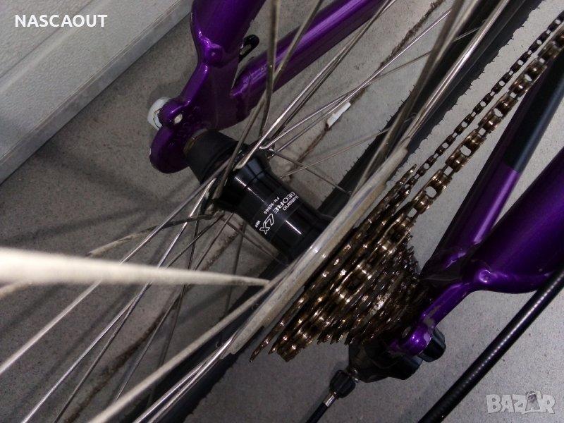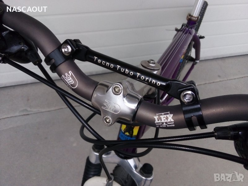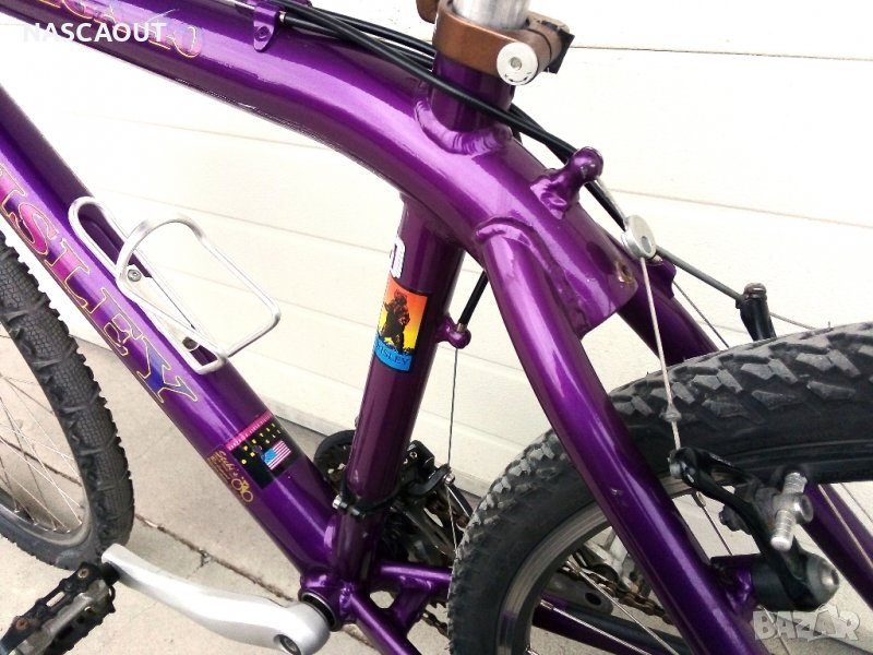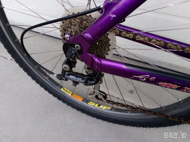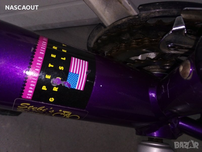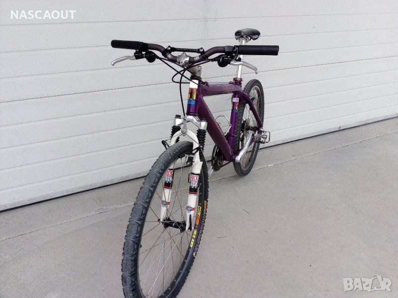 Ранен планински алуминиев велосипед произведен в САЩ в началото на 90-те представител на най напредничавите дизайнери за времето си вдъхновил много следващи производители от велоиндустрията и изпъкващ с шаренията и колоритността в духа на времето / Твърда рамка от широки олекотени тръби с пурпурен цвят /металик/ като FORD POP V8 на Wheeler dealers / Предна вилка - ROCK SHOX / Пълен монтаж Shimano Deore LX /3х8/ включително главините окомплектовани с шини Mavic Open CD SUP - но са с размер 559 /26"/ Седалка - оригинална брандирана от телешка кожа / Лапа и кормило 3ttt by Ross Shafer / В пълна изправност и готов за езда / Доставка около 25лв до офис на Лео експрес / Това не изключва доставка с друг куриер при желание.