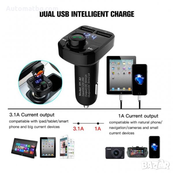 FM Трансмитер Х8 работещ Bluetooth. Нужно е само да включите Bluetooth фукнцията на телефона си и да го сдвоите с трансмитера. Можете да слушате музика в автомобила напълно безжично, както и да приемате разговори чрез функцията "Свободни ръце".