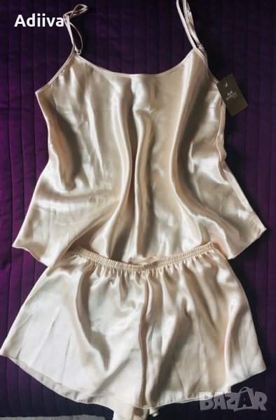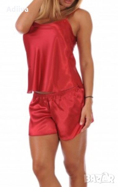 Изчистена сатенена пижама от две части- къси панталонки с ластик на ханша и топ с тънки регулиращи презрамки.