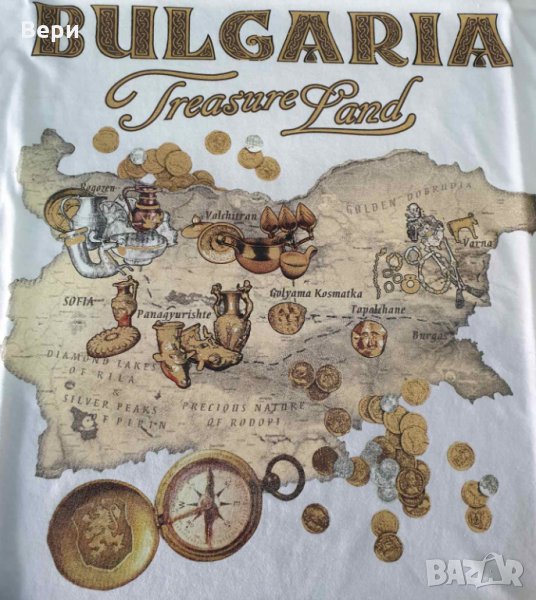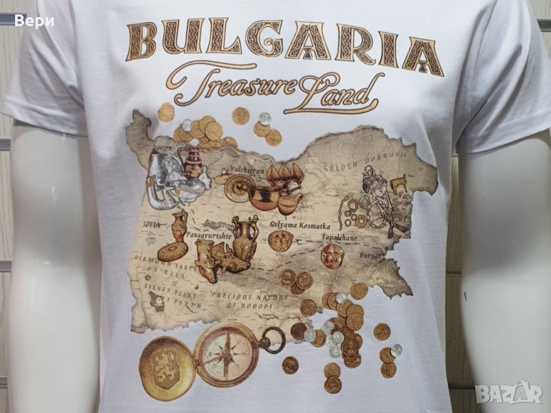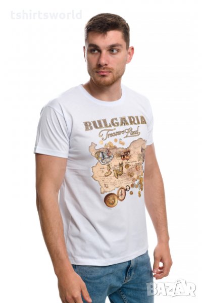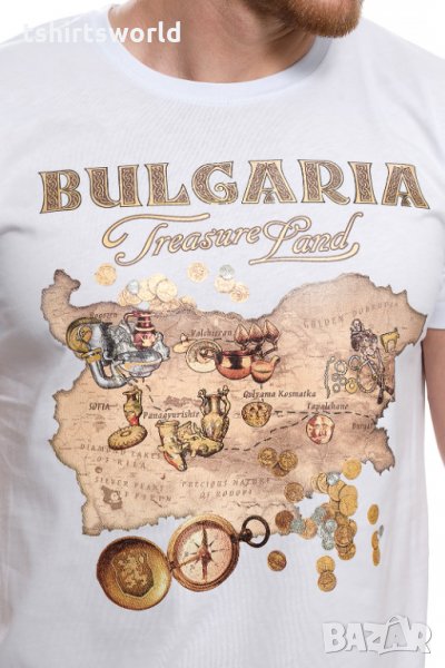 Нова бяла мъжка тениска с трансферен печат България - Treasure Land (Земя на съкровищата)