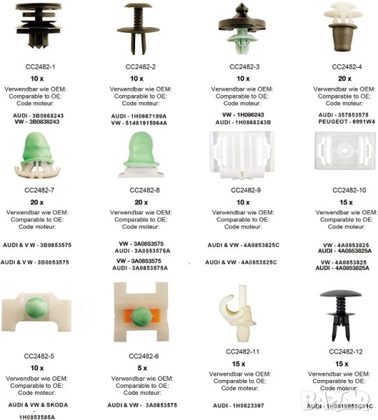 Асортимент от най-често срещаните щипки/клипсове за тапицерия, открити на AUDI
