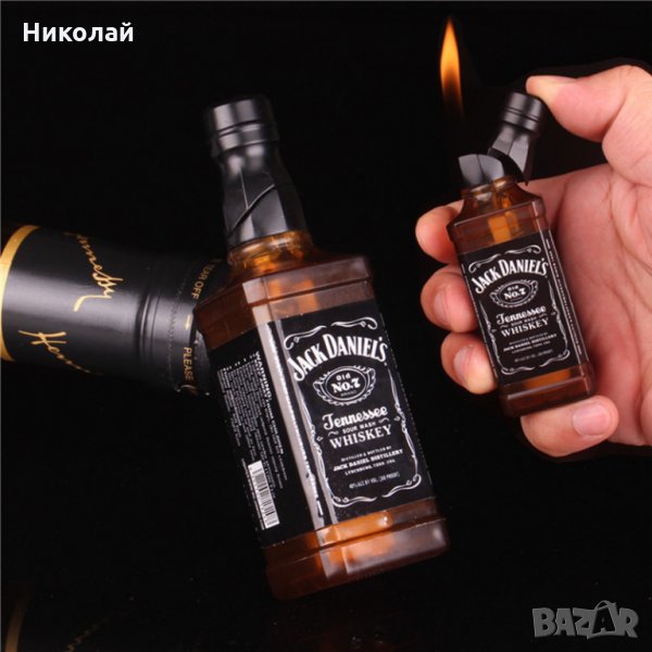 Интересна запалка във формата на бутилка уиски Джак Даниелс , Jack Daniels . Изработена е от пластмаса и е с големина колкото патронче уиски от 50 мл. На дъното има отвор за пълнене с газ . С нея можете да палите