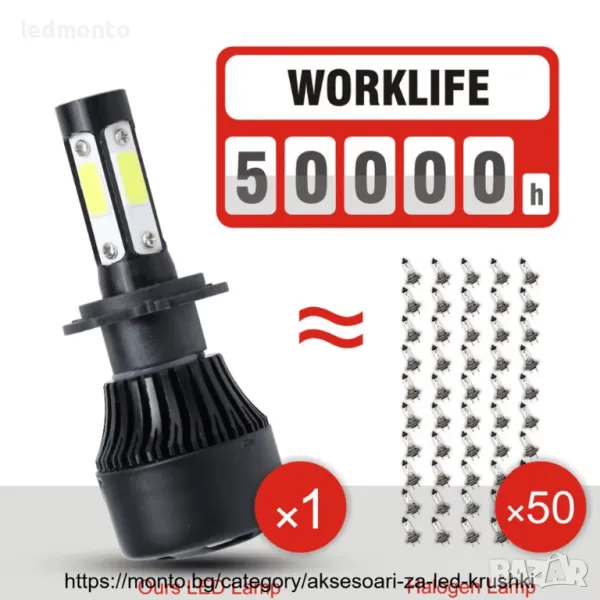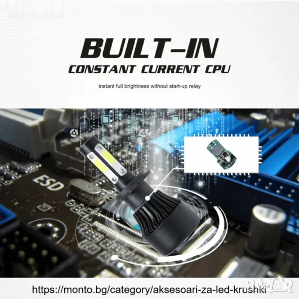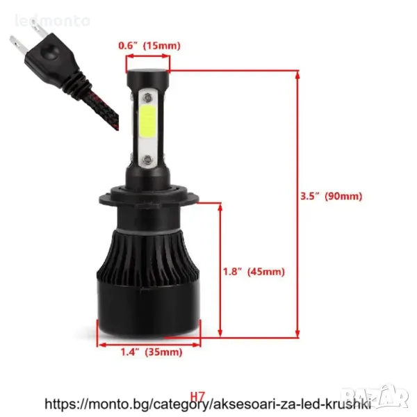 LED крушките са с ( BRIDGELUX) COB 2ра генерация диод от ново поколение, монтиран върху МЕДЕН радиатор с по-добро охлаждане имат и вентилатор с 12000 оборота в минута . Създават светлинен поток с над 300 % по-ярка светлина, спрямо стандартните халогенни крушки и са подходящи за всички фарове с рефлектори.