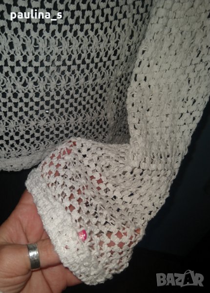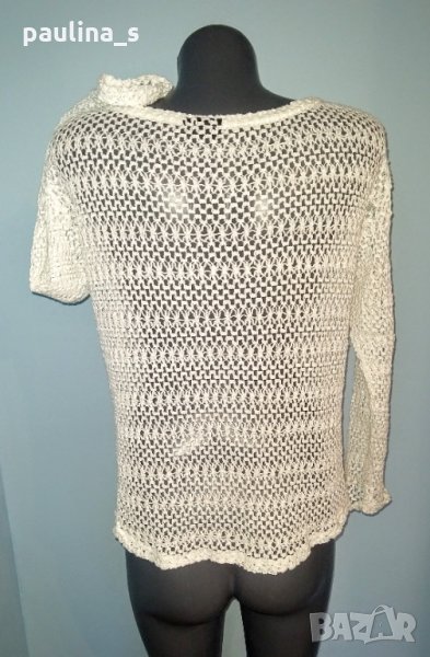 Дизайнерска блуза тип туника от дантела. Моделът е прав с издължаване отзад, ръкавите са с фабрично фиксирани подгъви. Материята е памук с примеси има еластичност и може да се носи от няколко размера. Много красива дреха. Без забележки, нова е без етикет.