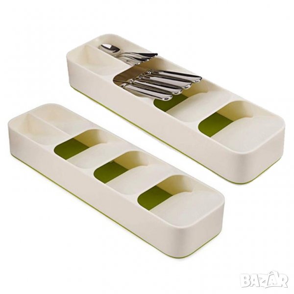 Това Двустепенен органайзер за ножове осигурява безопасно съхранение и лесен достъп към вашия ножове. Най-високо ниво за малки ножове, долен слой за големи ножове. Съхраняване на вашия прибори за хранене тен ъгълът позволява ти да съхраняване на a пълен комплект of прибори за хранене за по-малко от половината пространство на конвенционална тава.