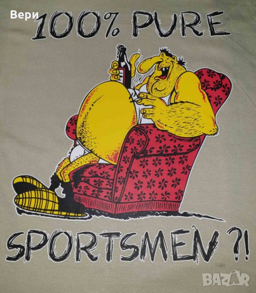 Страхотна нова мъжка тениска в цвят екрю с трансферен печат 100% PURE SPORTSMEN. Тениската е изработена в България под марката PRINTEX от висококачествен 100% пениран памук на 170 гр./м², който запазва цялостта на материята и наситеността на цветовете дълго време. С удобна кройка, тениската е свободна и позволява максимален комфорт при носене. Професионално изработен висококачествен трансферен печат с размер 26х28см, устойчив на пране с години. Тениската може да се пере при температура до 40 градуса. Спокойно можем да гарантираме за качеството на изработката и ярките цветове на дизайна.