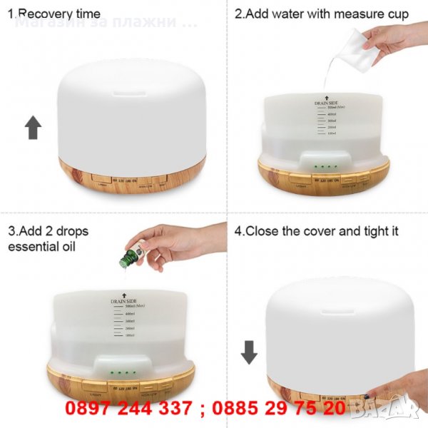 Използвайте само ЕТЕРИЧНИ масла, но не и ТЕСТЕРИ от ПАРФЮМИ. Не използвайте само етерични масла (работи само в комбинация с вода и етерични масла), като е желателно да бъде добре почистен и подсушен след изчерпване на количеството вода и също така не е препоръчително да се използва застояла вода.