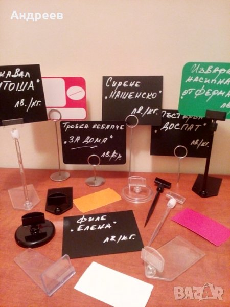 Предлагаме всякакви комбинации на етикеция за щандови витрини, щандове, топли точки, касетки за плодове и зеленчуци и др. При нас ще откриете също и поставки за цени, игли, стойки, крепежи, окачващи елементи, рамки А4 и др.