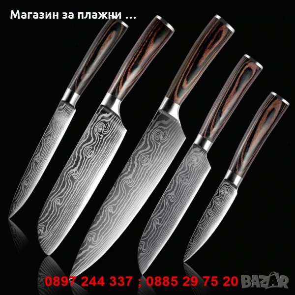 - Комплект 4 включва 5бр. готварски ножове: 8" нож на главния готвач + 5" нож Сантоку + 3.5" нож за белене + 7" нож Сантоку + 8" нож за месо - 43.00лв