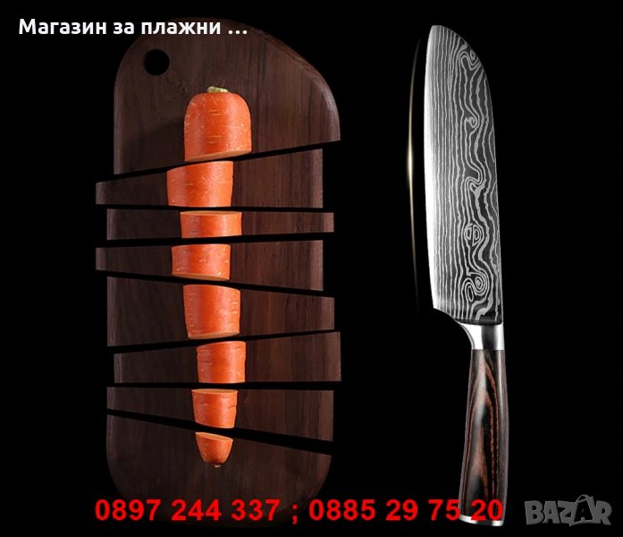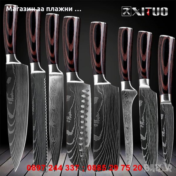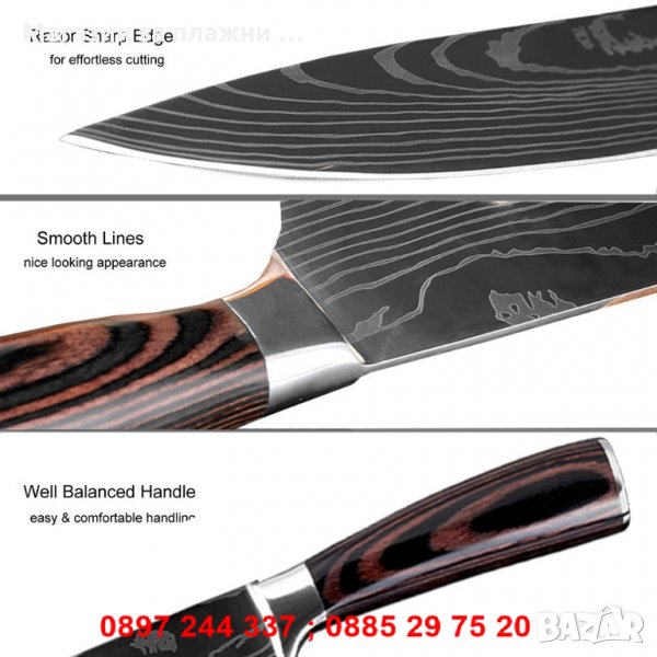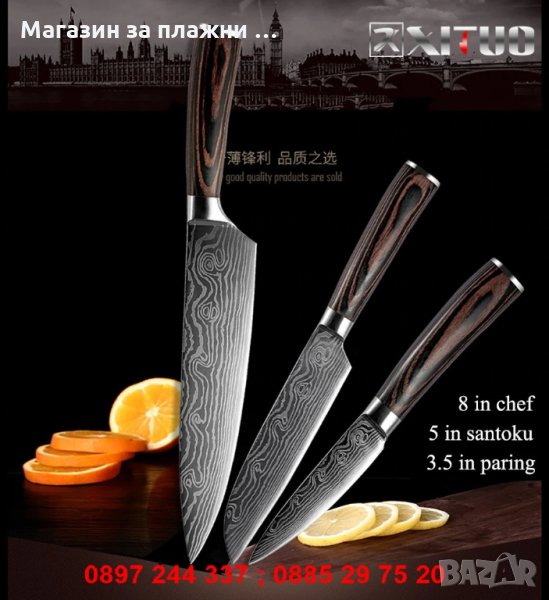 - Комплект 3 включва 4бр. готварски ножове: 8" нож на главния готвач + 5" нож Сантоку + 3.5" нож за белене + 7" нож Сантоку - 38.00лв