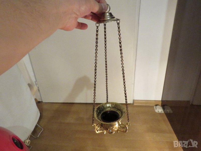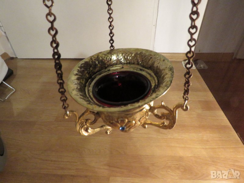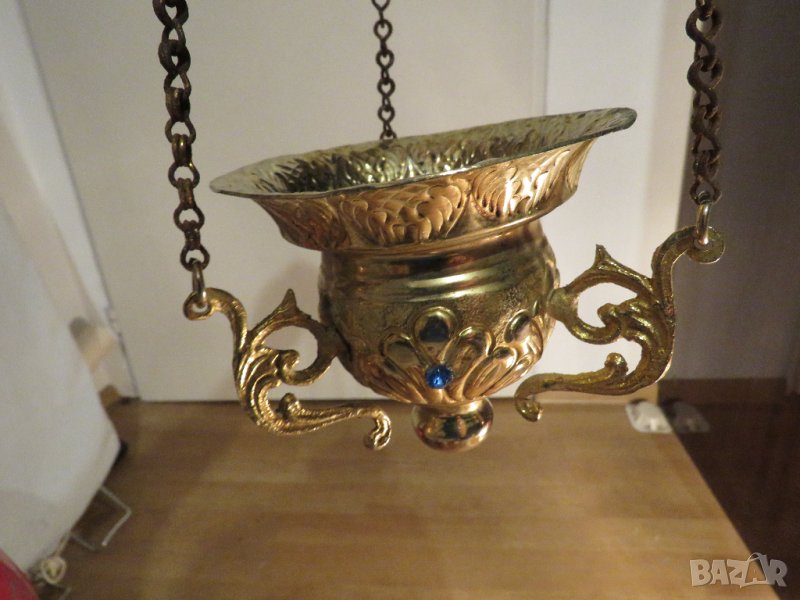 Старо кандило, голямо Старинно висящо бронзово кандило със сини камъни -вис 40 см.