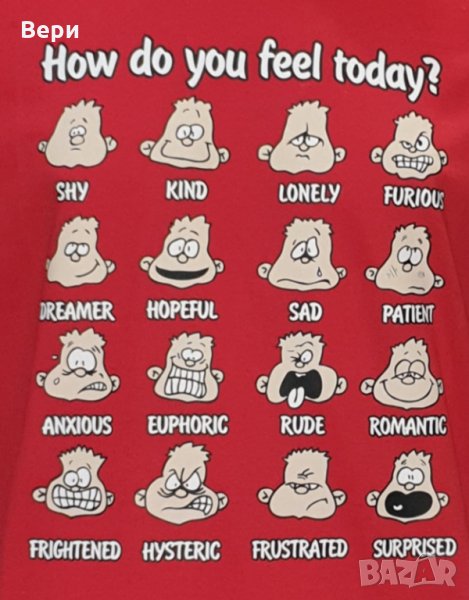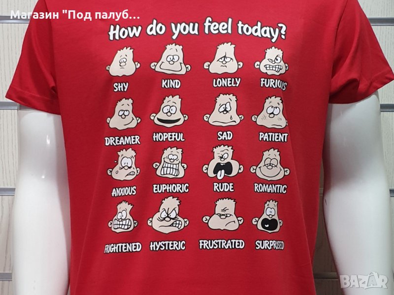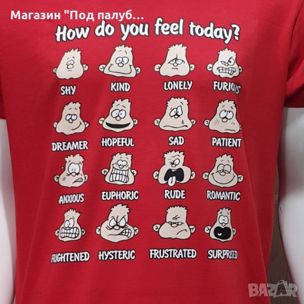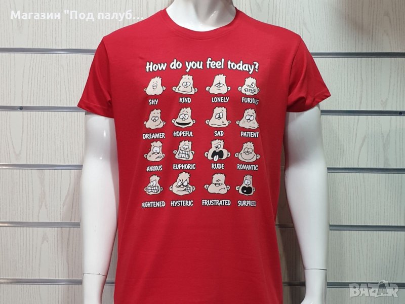 Страхотна нова забавна мъжка тениска в червен цвят с трансферен печат How do you feel today?, човечета. Тениската е изработена в България под марката PRINTEX от висококачествен 100% пениран памук на 170 гр./м², който запазва цялостта на материята и наситеността на цветовете. С удобна кройка, тениската е свободна и позволява максимален комфорт при носене. Професионално изработен висококачествен трансферен печат, устойчив на пране с години. Тениската може да се пере при температура до 40 градуса. Спокойно можем да гарантираме за качеството на изработката и ярките цветове на дизайна.