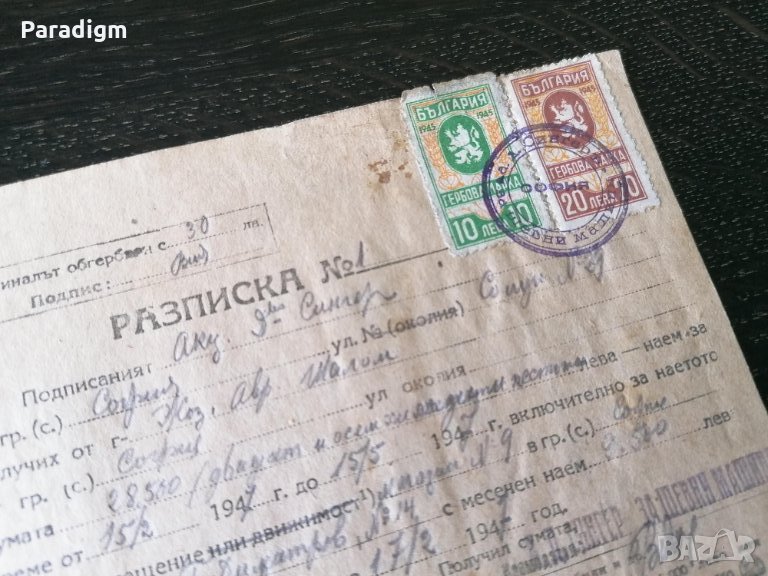 Разписка за получена сума с гербови марки - 1947г.